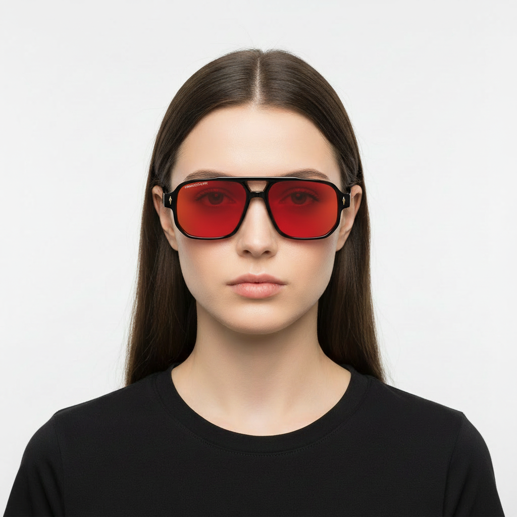 Las gafas ASTON BLACK RED de Handover ofrecen un diseño sofisticado con lentes rojo transparente con montura negra brillante. Un look único que combina elegancia y personalidad.